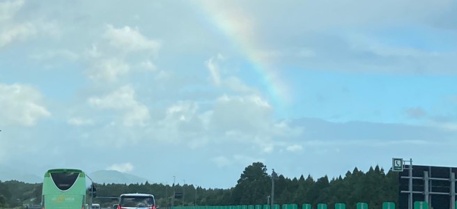 断続的に渋滞が発生しており、結局目的地に着いたのは13時15分頃です。途中で虹が見える所がありました。