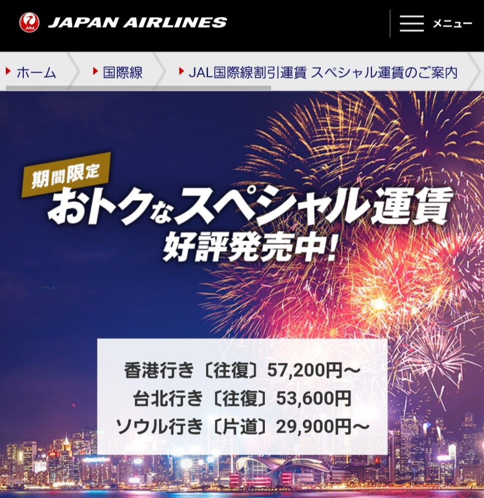 一方、JAL国際線が期間限定で割引運賃を提供しています。こちらもよくやっていますが、恩恵を受けたことはありませんでした。