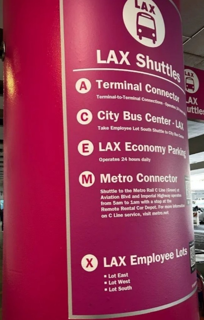 無料バスはLAXの各ターミナルに濃いピンク色の柱があり、そこが乗り場になります。いろいろなバスがくるのでMetro Connector と表示のあるバスが来たらそれに乗ります。