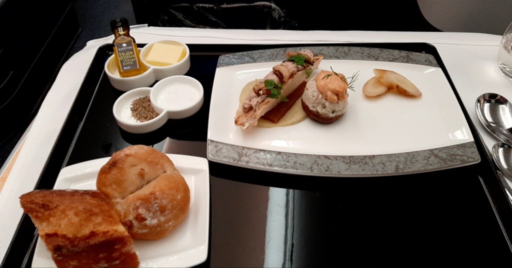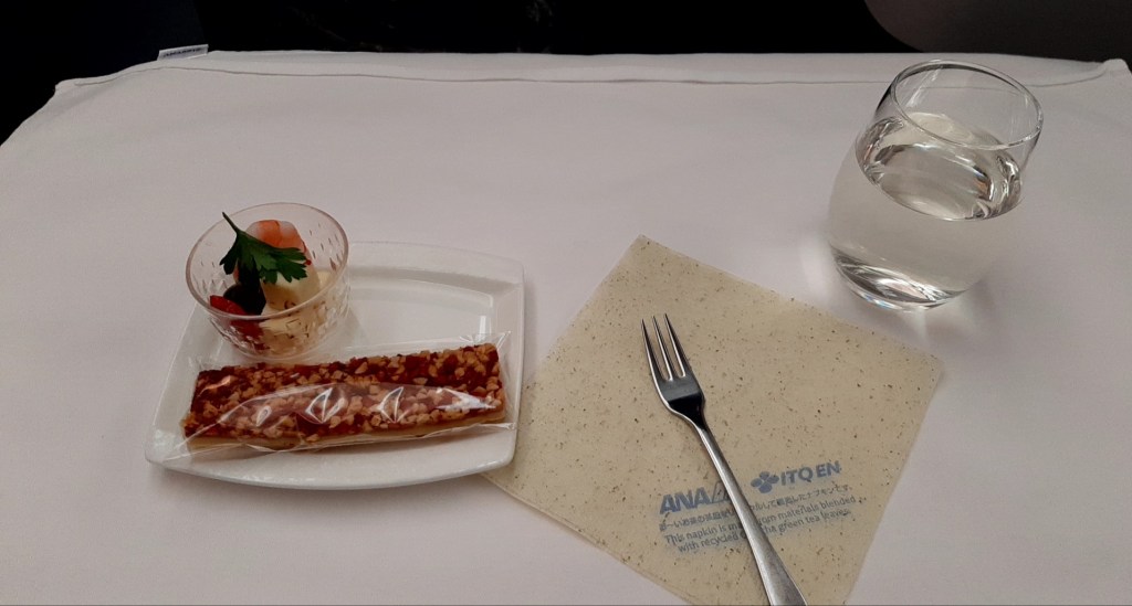機内食の時間になり、最初にアミューズが出てきます。「ANAオリジナルスティック」と「海老のマリネ チーズとオリーブ」。ドリンクは「獺祭 純米大吟醸磨き二割三分」を頼みました。