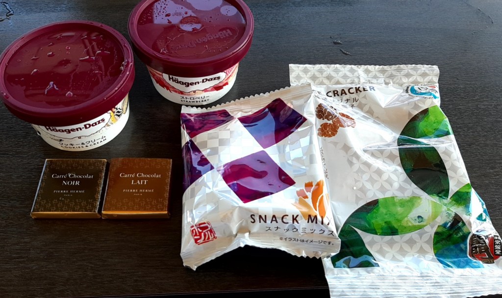 チェックインを済ませ、ラウンジのスタッフがせっかくですので、とビールやドランク数本とお菓子やおつまみを袋に入れて持たせてくれました。