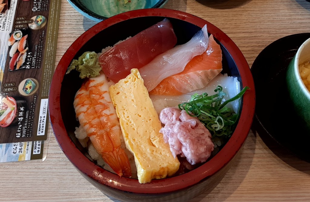 最初の目的駅に着きました。お腹が空いたなぁと思いながら歩いていると激安寿司ランチの看板が目に入り、吸い込まれてしまいました。
