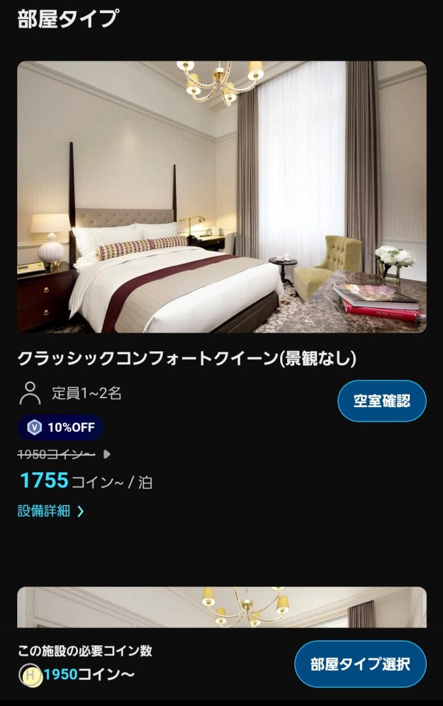 もうワンランク上の「パレスサイドスーペリアツイン」は2,700~3,000コイン必要ですが、比較的空きがあります。