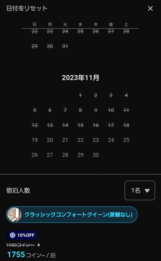 一番安い「クラシックコンフォートクイーン」は1,950HafHコインで宿泊できます。3ヶ月前から予約できるのですが、夜中0時ちょうどにタップしても成功しません。10回くらいトライしましたが、トラさんの持っているパソコンやスマホのスペックと通信環境では無理だと諦めました。