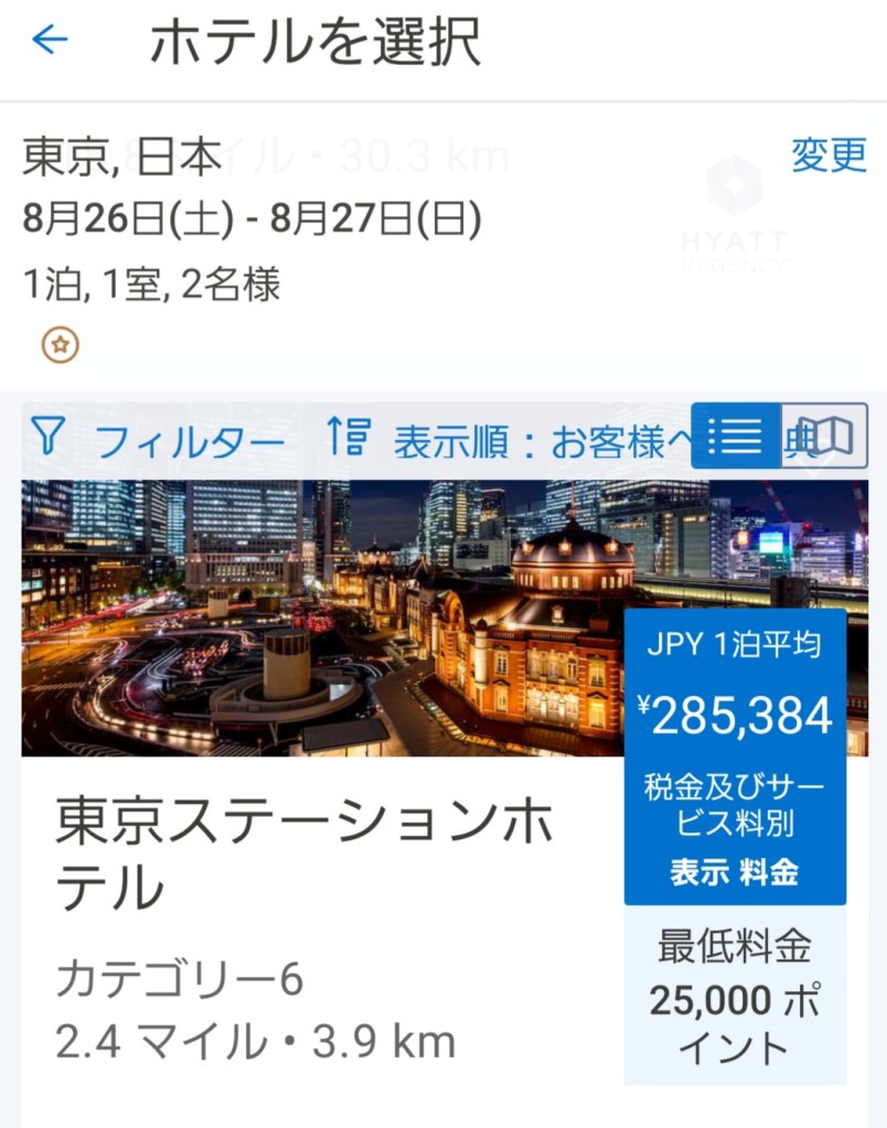 当初、WORLD OF HYATT のポイントを使って宿泊しようと予約もしていました。1泊25,000ポイントでしたが、1ポイント2円程度で購入することもできるので、50,000円より価値が高いと思えばポイント宿泊は効果があります。