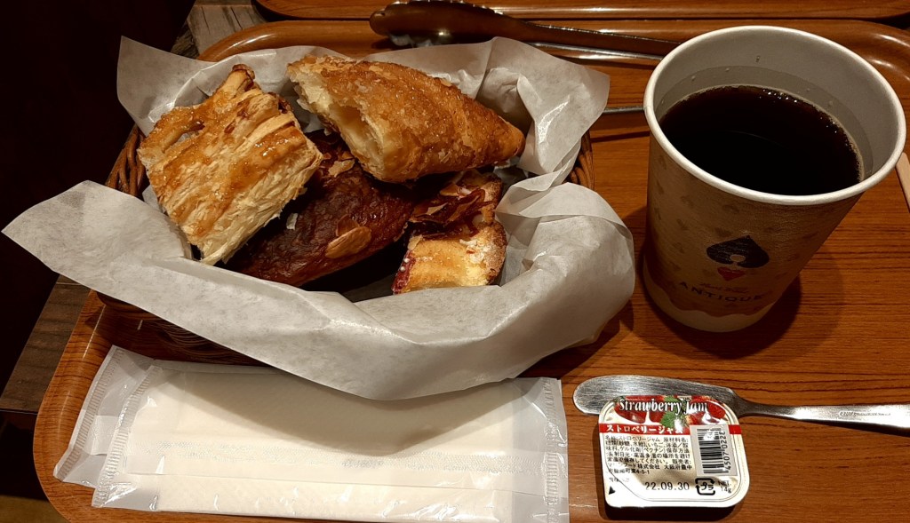 24日の朝食はファミレスの「Joyful」。トラさんは豚汁朝食ドリンクバー付(649円)、カウちゃんはモーニングエッグプレートスープ&ドリンクバー付(649円)を頂きました。