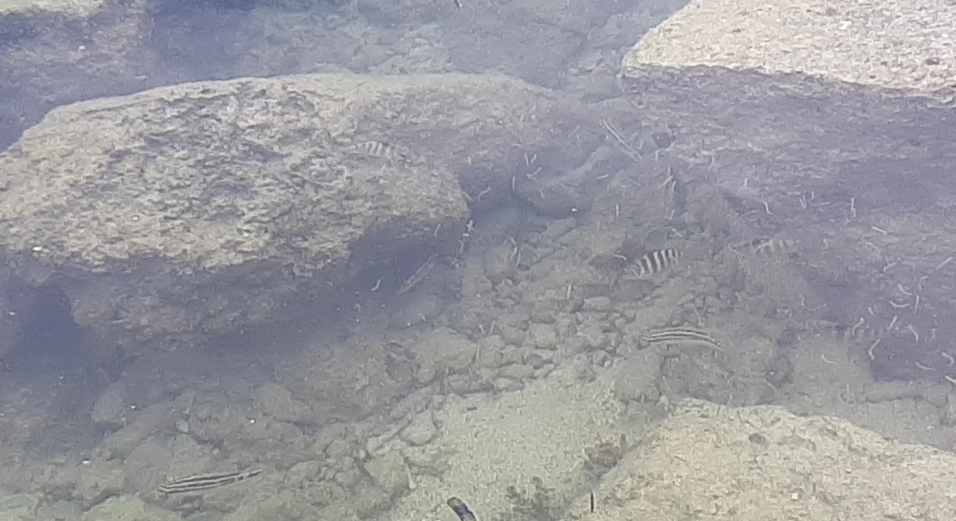 岩場には青色や黄色といったカラフルなお魚ではありませんが、熱帯魚っぽいのが数種類泳いでいました。