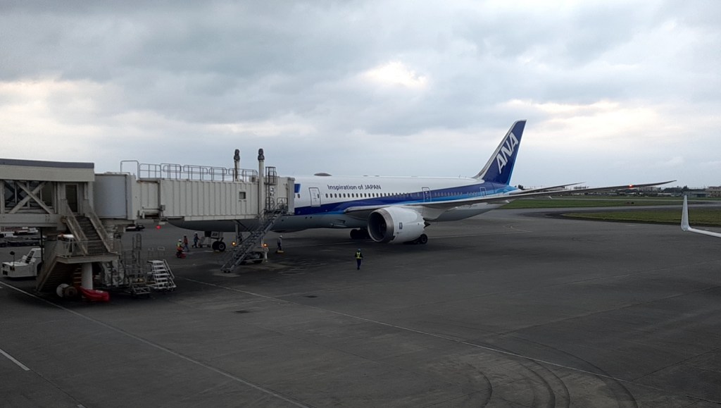セントレア行きのJTAに乗ろうとすると、お隣のゲートにANAのB787 DREAM LINERが到着しました。宮古空港にも離着陸するのですね。
