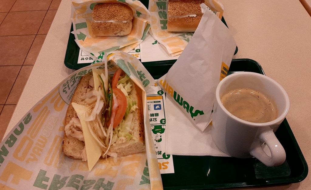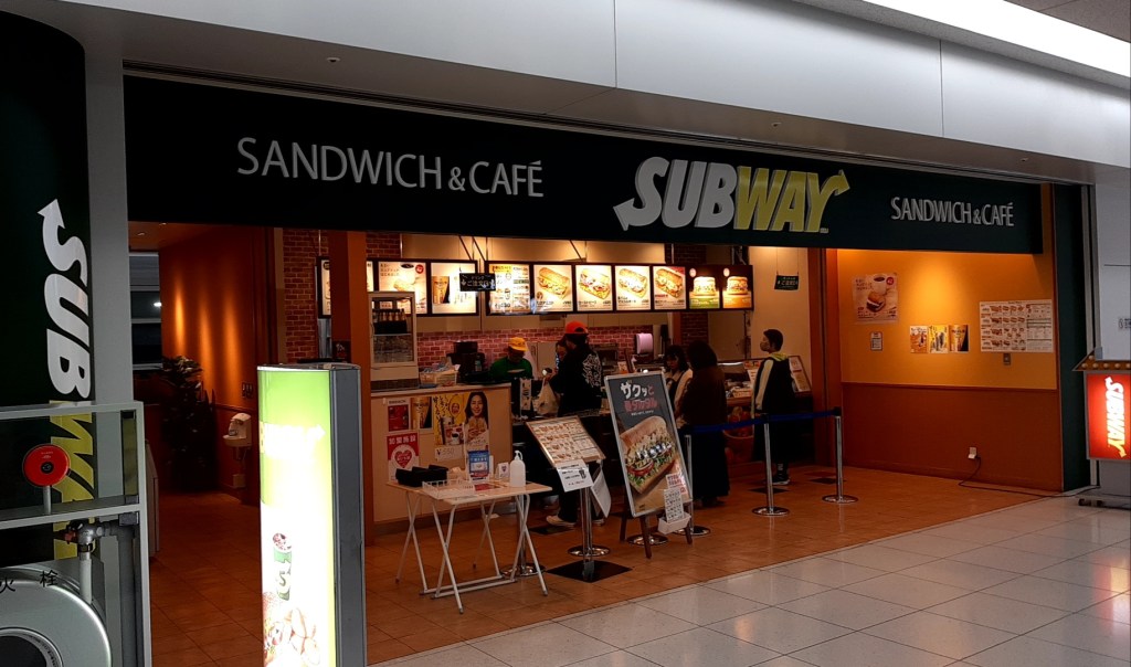 20:35の定刻に着きましたが、食事ができる所がほとんどありません。2階到着フロアにあるSUBWAYが唯一21:30オーダーストップの神対応なお店でした。