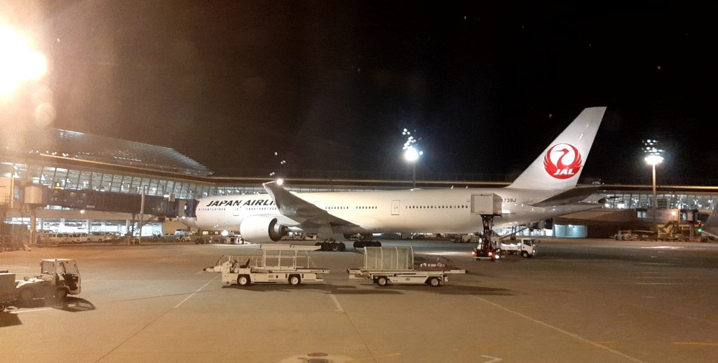 機内でいろいろ調べているうちにセントレアに到着しました。お隣のゲートには羽田空港から到着したばかりと思われるB777の国際線仕様機です。