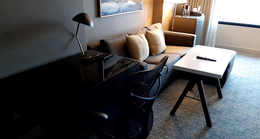 アサインされたお部屋は、43階のパークスイートでした。100㎡の広さがあり、入口を入るとリビングルーム、ベッドルーム、バスルームと続いているので、一周すると元の入口に戻って来れるようになっています。